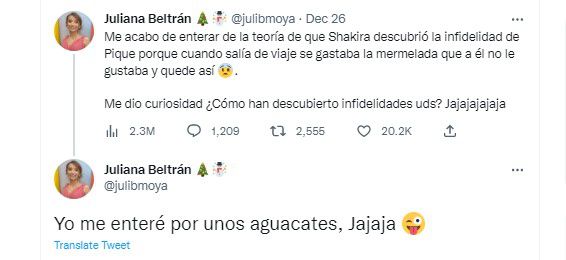 “Me acabo de enterar de la teoría de que Shakira descubrió la infidelidad de Piqué porque cuando salía de viaje se gastaba la mermelada que a él no le gustaba. Me dio curiosidad ¿Cómo han descubierto infidelidades uds? Jajajajajaja”.