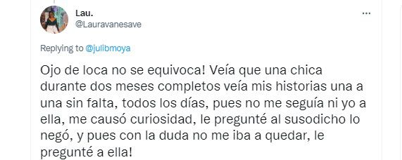La siguiente usuaria fue taxativa y aseguró que “Ojo de loca no se equivoca!”, confesando que “Veía que una chica durante dos meses completos veía mis historias una a una sin falta, todos los días, pues no me seguía ni yo a ella, me causó curiosidad, le pregunté al susodicho lo negó, y pues con la duda no me iba a quedar, le pregunté a ella!”
