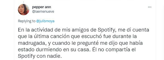 Otra usuaria advirtió que Spotify es una gran herramienta para cazar infieles: “En la actividad de mis amigos de Spotify, me di cuenta que la última canción que escuchó fue durante la madrugada, y cuando le pregunté me dijo que había estado durmiendo en su casa. Él no compartía el Spotify con nadie”.