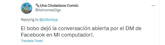 La siguiente usuaria escribió que: “El bobo dejó la conversación abierta por el DM de Facebook en MI computador!”.