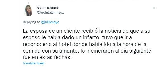 El siguiente caso incluye un infarto: “La esposa de un cliente recibió la noticia de que a su esposo le había dado un infarto, tuvo que ir a reconocerlo al hotel donde había ido a la hora de la comida con su amante, lo incineraron al día siguiente, fue en estas fechas”.
