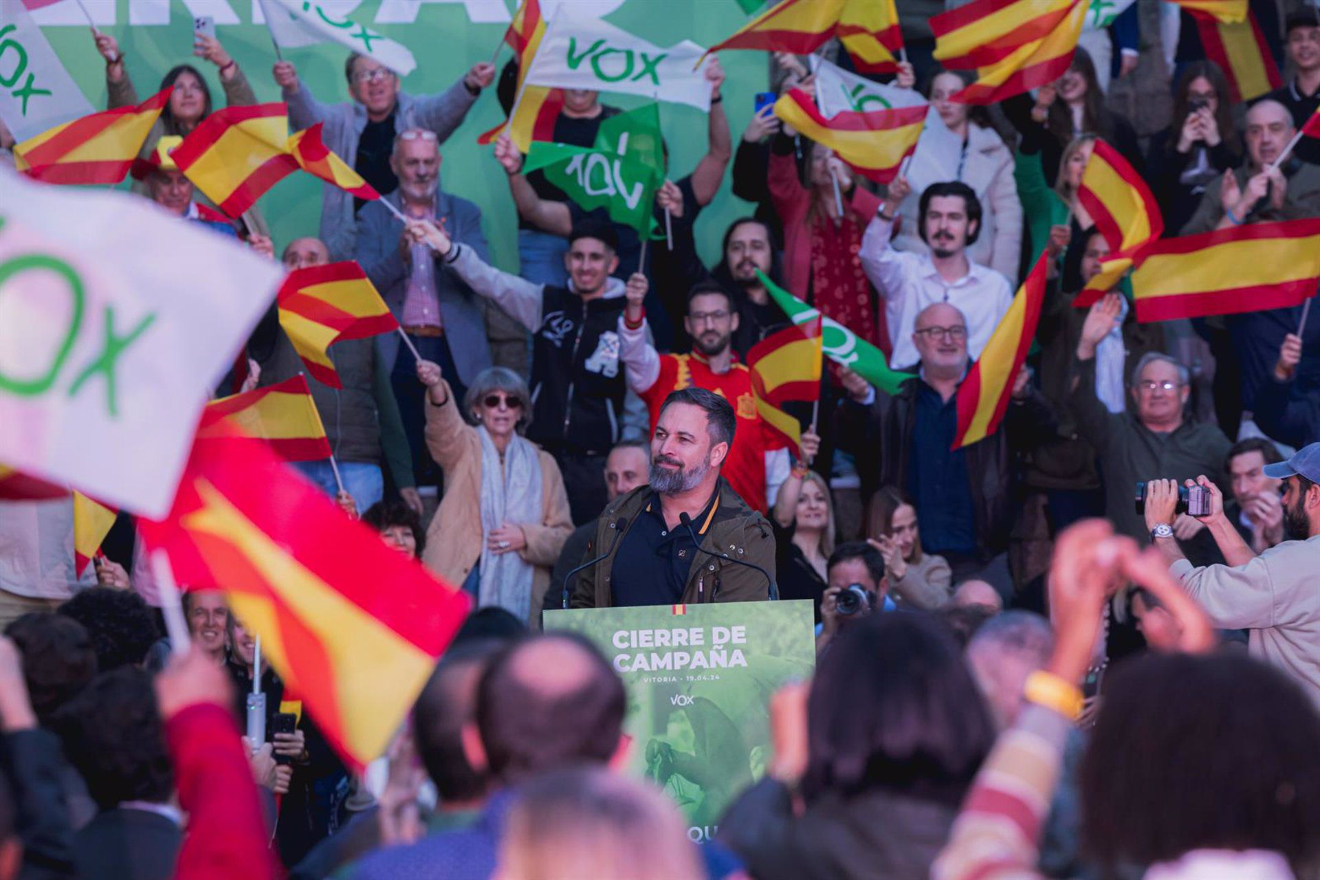 El presidente de Vox, Santiago Abascal, ha advertido de que «la unidad nacional y la propia identidad de los vascos está en jaque por la debilidad de los partidos nacionales», y ha criticado que este domingo «las dos primeras fuerzas que se disputan la victoria son dos fuerzas separatistas legitimadas por los partidos políticos españoles». Además, cree que estas elecciones «son una mentira a la sociedad vasca» por parte de «tres partidos que están gobernando juntos en Madrid y aquí vienen a hacer una peleíta». Vox ha celebrado en la plaza de los Fueros de Vitoria-Gasteiz el acto de cierre de campaña, en el que Abascal ha estado acompañado por el secretario general del partido, Ignacio Garriga; y los candidatos de Vox por Álava, Bizkaia y Gipuzkoa. En su intervención, Abascal ha advertido de que «la unidad nacional y la propia identidad de los vascos están en jaque por la debilidad de los partidos nacionales» y ha defendido que «el País Vasco es una región de España». «Hay que hablar claro porque, cuando sale el del PP y dice que Euskadi es un gran país, habla como el del PNV, se mueve como el del PNV y quiere pactar. Diremos que son como el PNV bis, y por eso es tan importante Vox, por eso hay que hacer un voto fuerte, por eso este domingo hay que votar con contundencia y sin concesiones», ha pedido. En este sentido, ha subrayado que este domingo «los separatistas, los traidores del PSOE y los flojos tienen que ver que hay una alternativa que defiende de verdad la unidad nacional, las libertades de todos, la igualdad ante la ley, la propiedad privada, y la prosperidad del campo y de la industria». «Para eso estamos aquí, no para ‘politiquerías’ ni para adaptarnos al discurso de los demás», ha subrayado antes de denunciar «la estafa del PSOE que se pelea aquí con el PNV y con Bildu, pero están pactando en Madrid». Por ello, cree que estas elecciones «son una mentira a la sociedad vasca» por parte de «tres partidos que en realidad están gobernando juntos en Madrid y aquí vienen a hacer una peleíta», y ha señalado que «el problema está en que el PNV legitima a Bildu y que el PP legitima al PNV». «Luego pasará lo que pasará este domingo, que las dos primeras fuerzas, las que se disputan la victoria, son dos fuerzas separatistas, legitimadas por los partidos políticos españoles», ha advertido. En este sentido, ha criticado que el líder del PP, Alberto Núñez Feijóo, «ofrece pactos al PSOE a nivel nacional» y en el País Vasco pactos al PNV cuando «a quien hay que ofrecer pactos es a esa parte de la sociedad vasca abandonada y traicionada, a la que ya sólo le queda Vox para defender la libertad, la unidad nacional, la seguridad en las calles y para decir que aquí los vascos y los españoles primero». El presidente de Vox ha criticado que esta campaña no se ha hablado de «los problemas de los ciudadanos» como «la inseguridad en las calles vascas» porque «todos están de acuerdo en las mismas políticas migratorias y también «están de acuerdo en la aplicación de la Agenda 2030 que arruina al campo». «Sabemos que el mensaje de dureza contra la inseguridad, el mensaje a favor de la industria, a favor de la agricultura, a favor de la ganadería, en contra de la Agenda 2030, es un mensaje que ha llegado y que muchos vascos estaban esperando escuchar, y un mensaje de ‘basta ya’ al nacionalismo vasco, que solo ha mirado por sus intereses partidistas y ha traicionado a la sociedad vasca», ha resaltado. Para Abascal, «no hay diferencia entre el resto de partidos», ya que en esta campaña cree que no ha habido «un debate de ideas y solo se ha escuchado ‘politiquería’, hablar de pactos y de no pactos, cosa que da igual porque ya estamos acostumbrados a verles mentir de manera irrefrenable». MANTENER EL ESCAÑO «Nosotros estamos aquí para decir precisamente lo que creo que una gran parte de los vascos sabe que es verdad, y por eso estamos muy esperanzados por el gran resultado que vamos a obtener este domingo», ha resaltado antes de mostrarse «absolutamente convencido» de que mantendrán el escaño en la Cámara vasca. El secretario general de Vox, Ignacio Garriga, por su parte, ha afirmado que el PNV, PSE-EE y Bildu, son «los mismos partidos que hay en Cataluña pero con diferentes nombres», y ha criticado que «el denominador común» es el PSOE, «el traidor de las clases medias y de las familias trabajadoras, que ha vendido vuestra tierra y que está dispuesto a vender nuestra querida nación». «¿Quién es el socio preferente del PNV o de Bildu? El PSOE. ¿Quién es el socio preferente de Junts o Esquerra Republicana? El PSOE», ha insistido antes de advertir que tras los resultados del domingo, el PSE-EE podría «pactar absolutamente todo con el separatismo». Por ello, ha pedido que el domingo acudan a las urnas «por defensa propia, por amar a lo propio y en contra de las políticas de socialistas y separatistas». «Que acudáis a las urnas en defensa propia, a defender la unidad de España, a defender nuestra industria, a defender nuestras familias, nuestra libertad, nuestra tradición y nuestra forma de ser», ha reiterado. LOS CANDIDATOS La cabeza de lista por Álava, Amaia Martínez, ha afirmado que estas elecciones Vox aspira a «seguir llevando la verdad en el Parlamento» y ha señalado que su partido no se presenta «para ganar en el País Vasco, sino para que el País Vasco gane» con Vox. «Es posible un País Vasco libre de separatismo», ha asegurado. La cabeza de lista por Bizkaia, María Pérez, ha defendido que, «a pesar de las tácticas infames del nacionalismo y del resto de los partidos», el mensaje de Vox «ha llegado claro y directo, sin manipulaciones» en esta campaña. «Necesitamos el voto de los vascos españoles y por eso lo pedimos. El voto de Vox es el voto vasco y el voto español», ha subrayado. El cabeza de lista de Vox por Gipuzkoa, Andrés Paramio, explicad